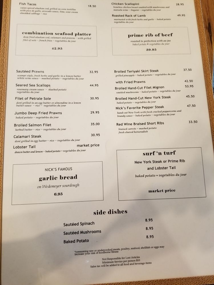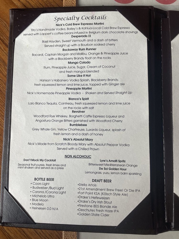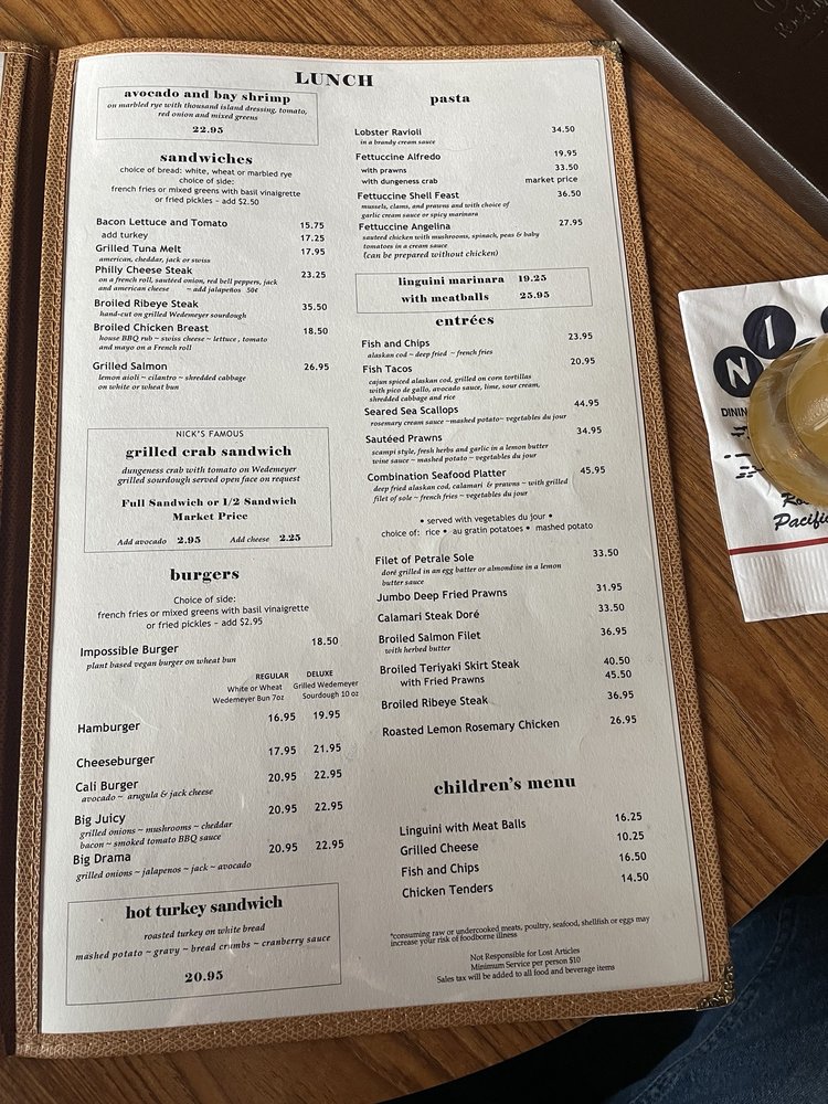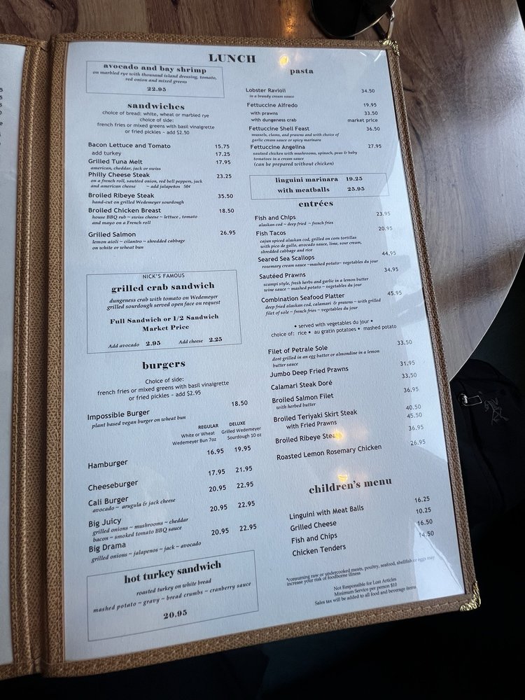 Nick's Seafood Restaurant in Pacifica, CA offers a diverse menu filled with seafood delights and a rustic atmosphere that has been pleasing customers for almost a century. With favorites like fish & chips, steamed mussels in garlic & wine broth, and fresh crab cakes, the restaurant caters to all seafood lovers. The crab sandwich, served with onion rings and clam chowder, is a must-try according to customers. The generous portions and waterfront view bring a touch of nostalgia and comfort to every meal. The attentive service and variety of dishes, including New York-style cheesecake and mud pie desserts, make dining at Nick's Seafood Restaurant a satisfying experience. Don't miss out on the happy hour specials, live music, and the chance to dine by the Pacific Ocean for a truly memorable dining experience.